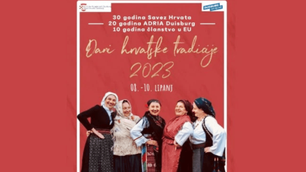 Hrvati u Duisburgu iskoristili su velike tri obljetnice kao priliku da ovog ljeta najave “Dane hrvatske tradicije“: njihova kulturna udruga “Savez Hrvata Duisburg” slavi 30 godina postojanja, njen najaktivniji ogranak folklorna skupina ADRIA 20 godina, a Hrvatska je prije deset godina primljena u EU.
