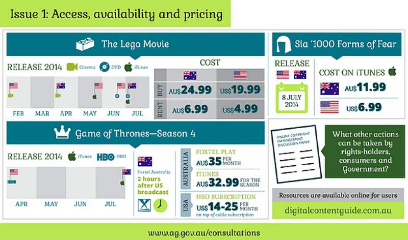 Turnbullov ‘slajd’ predstavljen je tijekom rasprave o politici autorskih prava australske vlade u utorak u Sydneyu. Na njemu se na nedavnim primjerima iz svijeta filma i muzike vidi koliko Australci dulje čekaju na izdavanje novih uradaka te koliko ih više plaćaju od Amerikanaca. Kao primjeri su navedeni ‘The Lego Movie’, četvrta sezona ‘Igre prijestolja’ i pjesma ‘1000 Forms of Fear’. Cijene u SAD-u su navedene u američkim, a u Australiji u australskim dolarima (1 AUD = 0,91 USD).