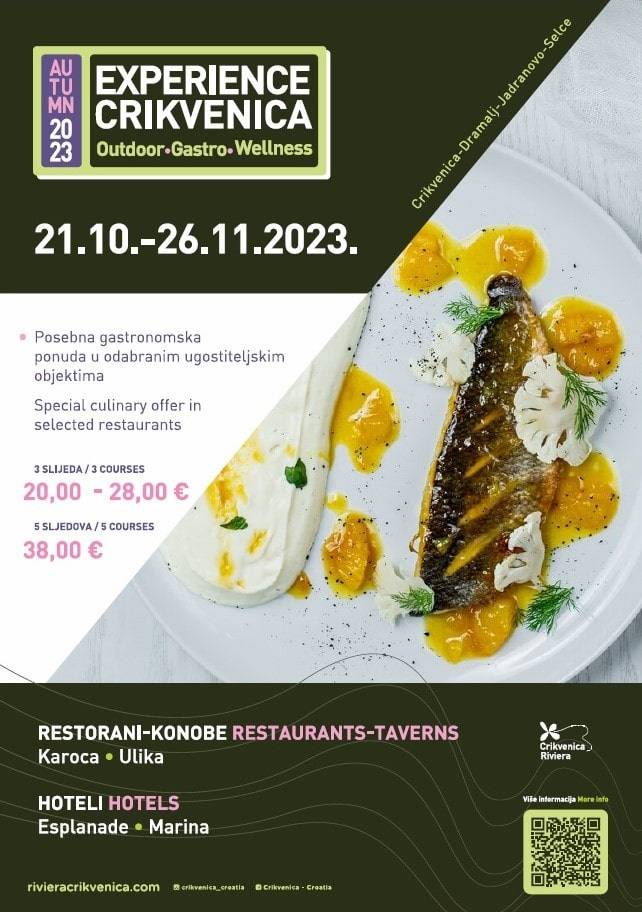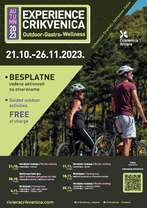 Od 21. listopada do 26. studenog 2023. na Rivijeri Crikvenica traje projektkoji obuhvaća aktivnosti i rekreaciju na otvorenome, opuštajuće wellness programe te posebne gastronomske ponude u odabranim ugostiteljskim objektima diljem crikveničke rivijere, a zove se „Experience Crikvenica“. Projekt je to koji ima dvije verzije – proljetnu i jesensku.