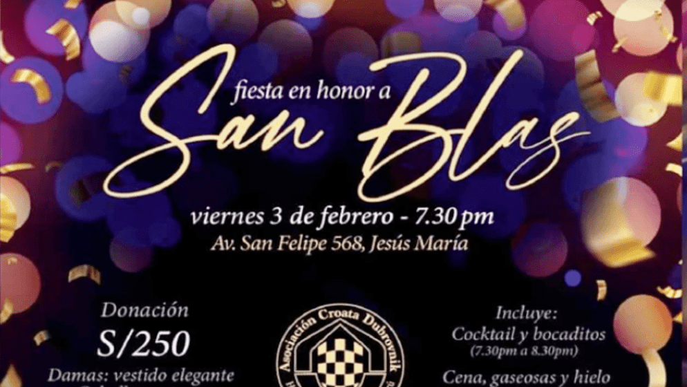 Hrvatska zajednica u Peruu slavi blagdan svetog Vlaha, zaštitnika Dubrovnika, misom u župi svetog Leopolda i svečanim domjenkom u sjedištu Hrvatske udruge Dubrovnik u Limi.