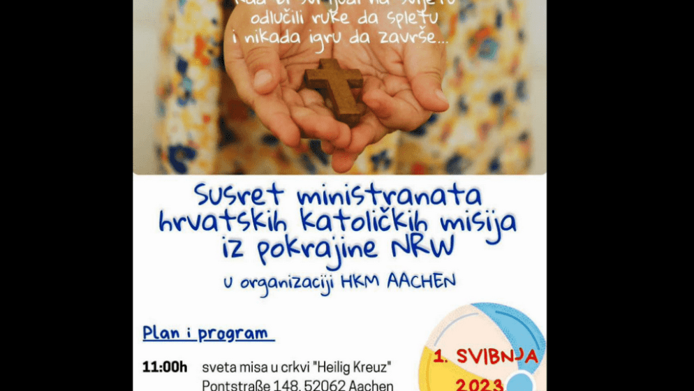 Hrvatska katolička misija Aachen objavila je da će se Susret ministranata hrvatskih katoličkih misija iz Sjevernog Porajnja i Zapadne Falačke održati u ponedjeljak, 1. svibnja.