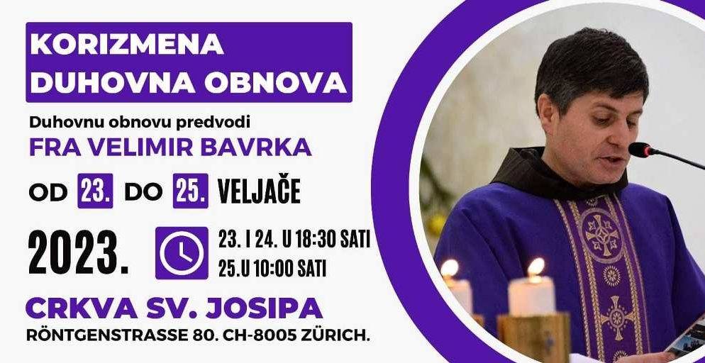 HKM Zürich poziva vjernice i vjernike da dođu na duhovnu obnovu koju će predvoditi fra Velimir Bavrka u crkvi svetog Josipa.