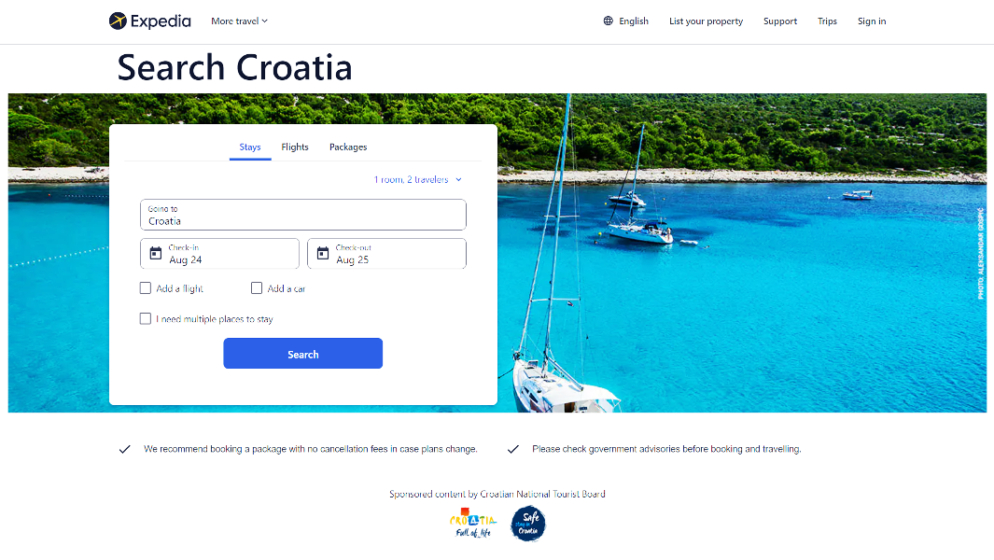 Hrvatska turistička zajednica pokrenula je promotivnu kampanju na Expediji, najvećoj online travel platformi na američkom tržištu koja broji više od 53 milijuna jedinstvenih posjetitelja te koja ima najveći potencijal u daljnjem poticanju turističkog prometa s ovog dalekog, ali za hrvatski turizam vrlo važnog tržišta.