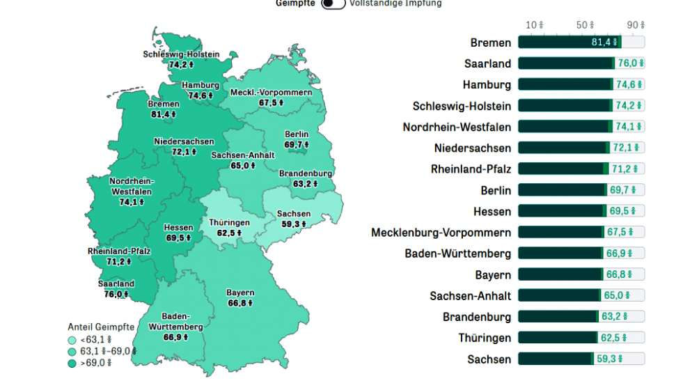 Gotovo 80 posto svih stanovnika Bremena u potpunosti je cijepljeno protiv koronavirusa. Ni u jednoj drugoj njemačkoj saveznoj državi stopa procijepljenosti nije tako visoka. U nastavku pogledajte tablice i analizu kretanja stope cijepljenih u Njemačkoj koje je objavio Institut Robert Koch (RKI).