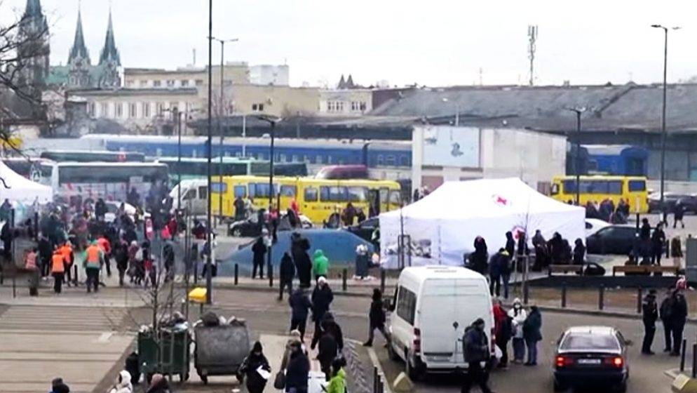 Na kolodvoru u Lavovu rukom je ispisani natpis iznad stubišta na kojem se maše putnicima u vlakovima prema granici: “Vratite se kući, domovina vas čeka.”
