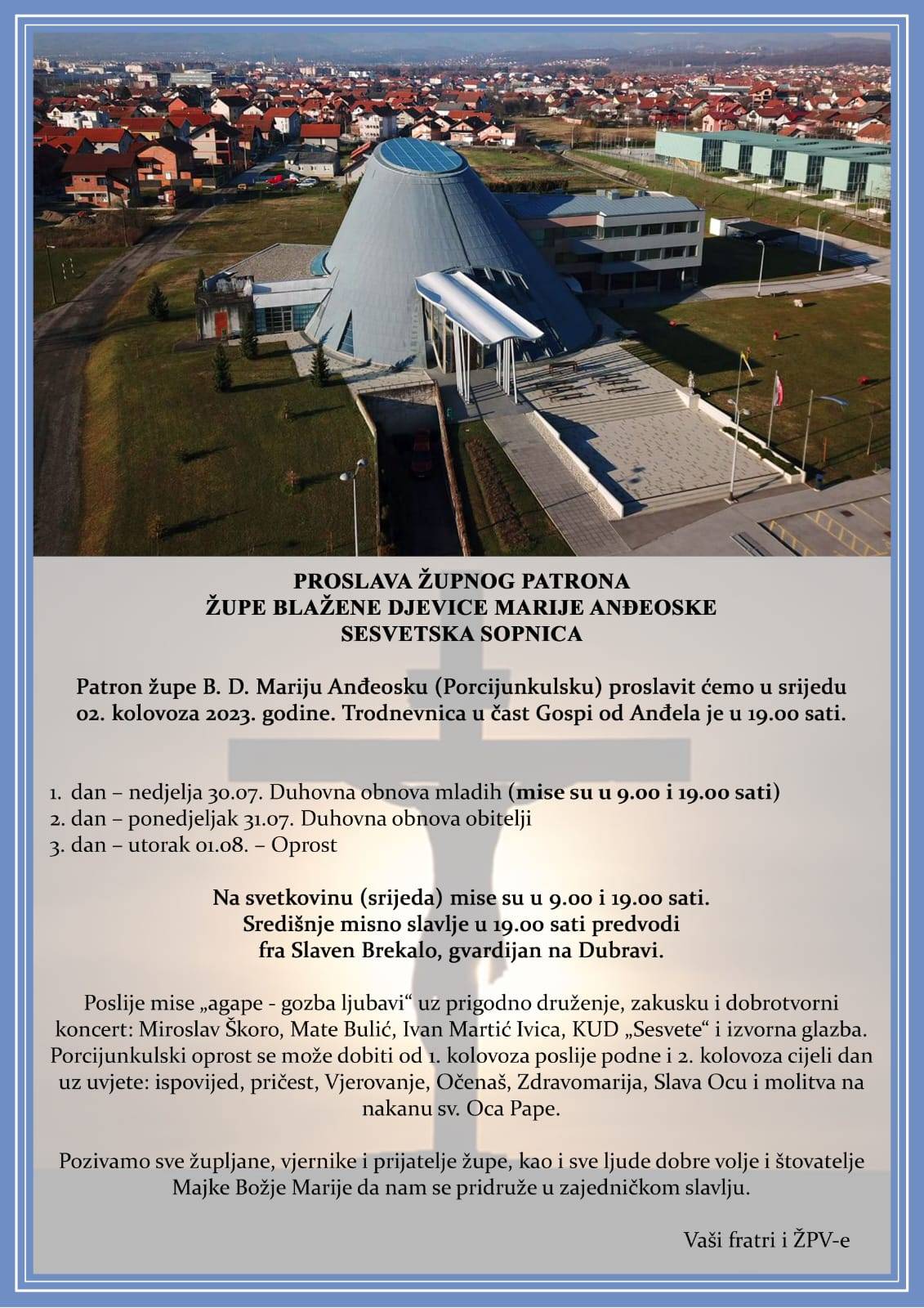 Svetkovina zaštitnice župe Blažene Djevice Marije Anđeoske (Porcijunkula) proslavit će se u srijedu, 2. kolovoza u Sesvetskoj Sopnici pokraj Zagreba.