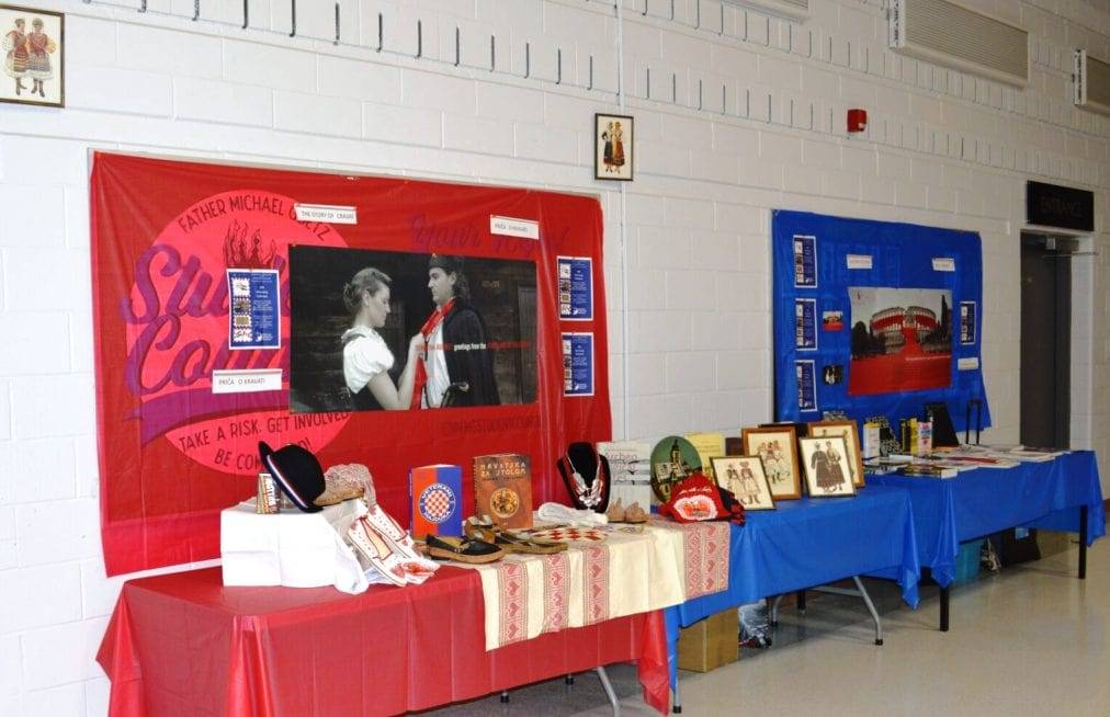 U izložbenom dijelu dvorane učenici su zajedno sa svojim nastavnicima pripremili izložbu s knjigama, udžbenicima i priručnicima, te izlošcima na temu hrvatskog folklora.