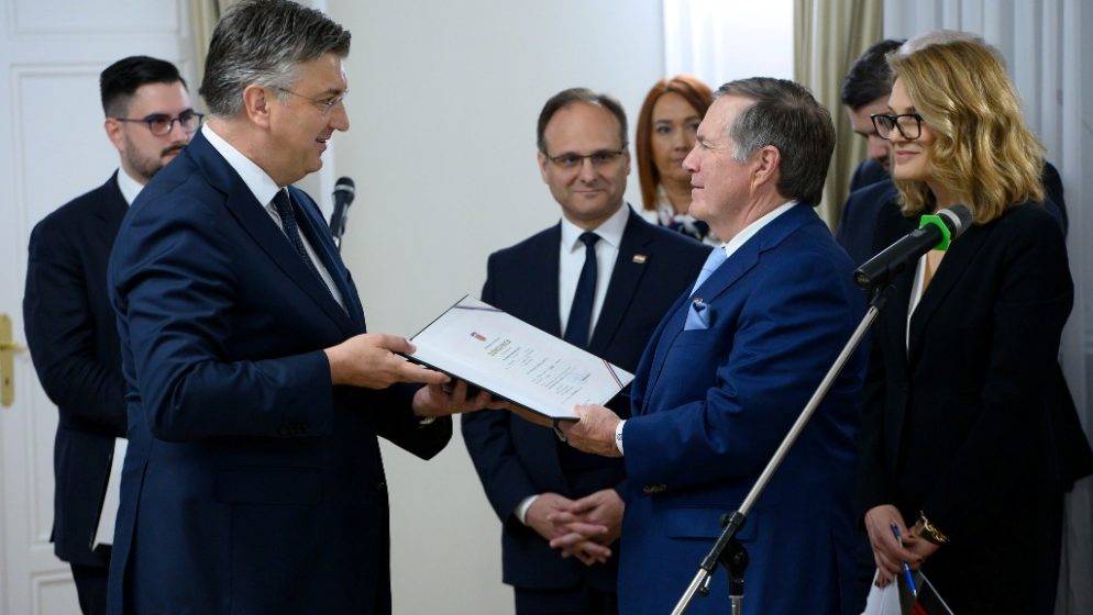 HR Iseljeništvo Proslavljeni Hrvat iz SAD-a Premijer Plenković uručio hrvatsku domovnicu Billu Belichicku, najtrofejnijem treneru u povijesti američkog nogometa