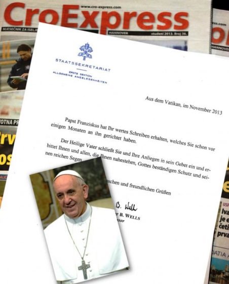 Papi Franji smo prije nekoliko mjeseci poslali primjerke našeg mjesečnika, te ga informirali o časopisu za iseljene Hrvate, koji zajedno s vama radimo već pune četiri godine. Ovih dana stiglo je pismo s priopćenjem da je Sveti Otac primio primjerke CroExpressa, te nam šalje najljepši i najvrjedniji dar – svoj apostolski blagoslov! Papa Franjo je primio Vaše vrijedno pismo, kaže se u priopćenju i dodaje: – Sveti Otac uključuje vas i vašu nakanu u svoje molitve, i udjeljuje vama, i svima koji vas podupiru stalnu Božju zaštitu i njegov obilan blagoslov. – U ime Svetog Oca priopćenje je potpisao mons. Peter B. Wells, predsjednik Državnoga tajništva.
