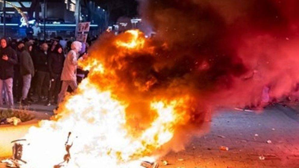 Video objavljen na društvenim mrežama prikazuje spaljene policijske automobile i izgrednike kako bacaju pirotehnička sredstva i kamenje na policiju.