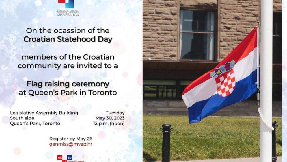 Generalni konzulat Republike Hrvatske u Mississaugi organizira svečanu ceremoniju podizanja hrvatske zastave povodom Dana državnosti Republike Hrvatske.