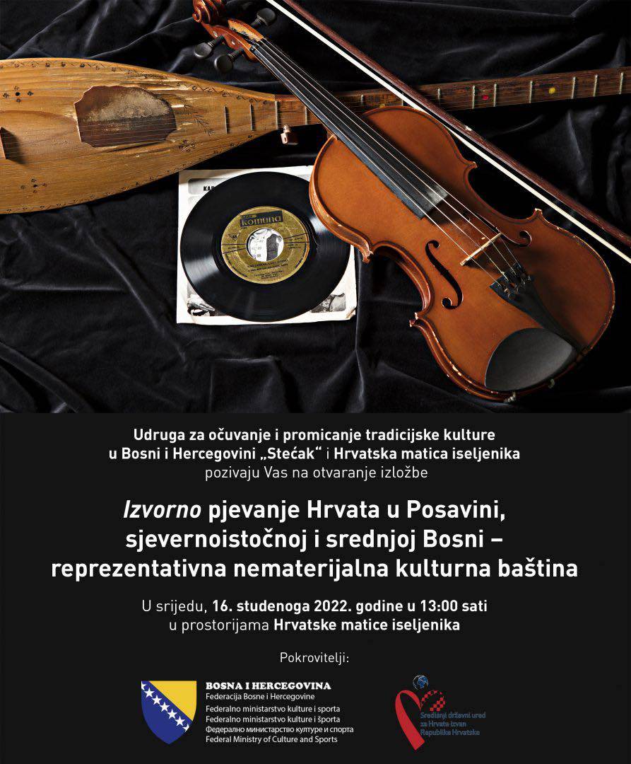 U srijedu, 16. studenoga s početkom u 13 sati, u prostorima Hrvatske matice iseljenika, Trg Stjepana Radića 3 u Zagrebu, otvorit će se izložba naslovljena “Izvorno pjevanje Hrvata u Posavini, sjevernoistočnoj i srednjoj Bosni“.
