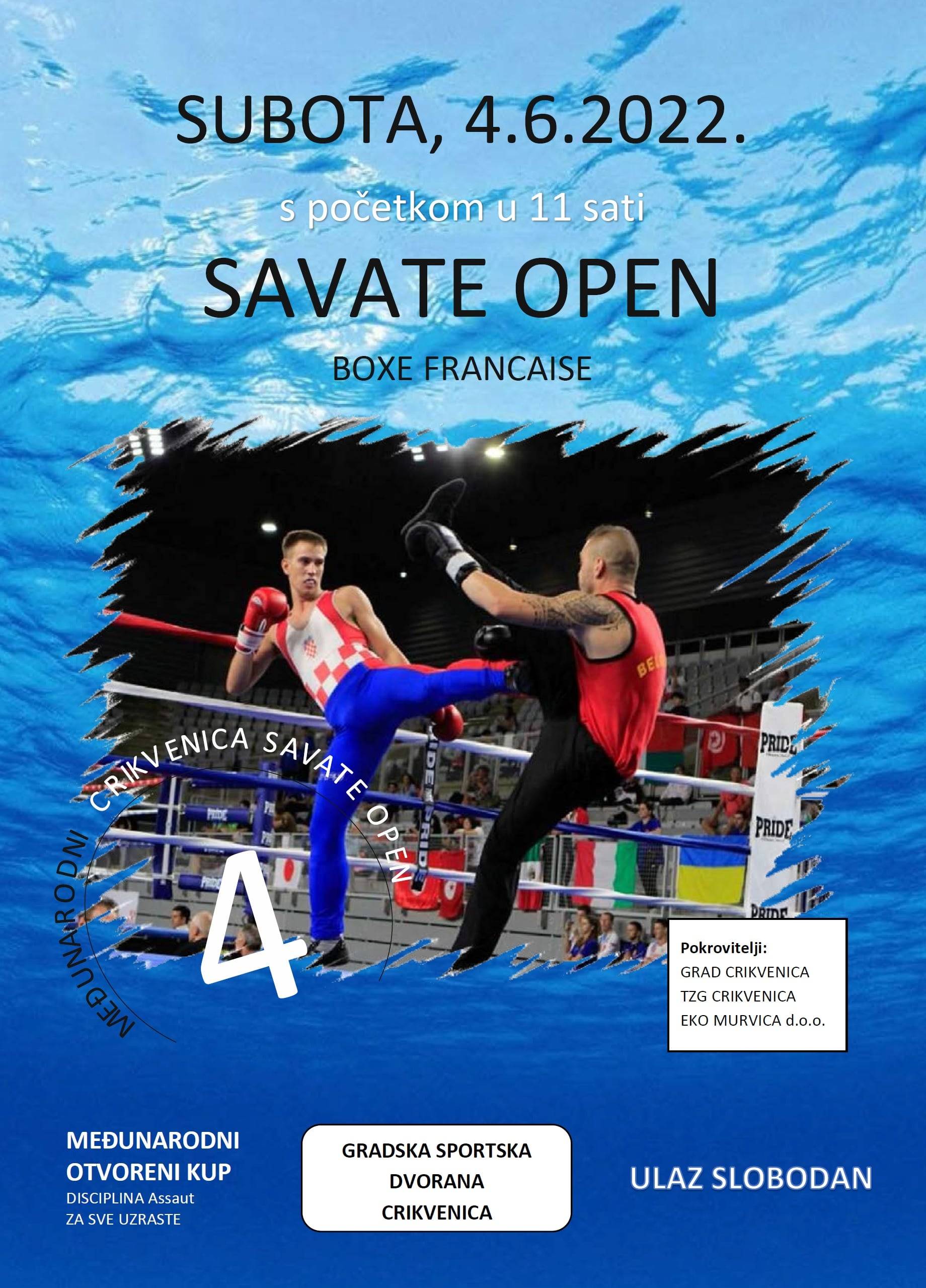 Crikvenica će ove subote, 4. lipnja, biti domaćin sportskog događanja, četvrtog poredu „Savate Open Crikvenica”. Riječ je o međunarodnom otvorenom turniru u disciplini assaut za sve uzraste, a održavat će se u crikveničkoj Gradskoj sportskoj dvorani, i to s početkom u 11 sati.
