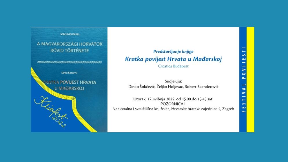 Hrvatska matica iseljenika i Festival povijesti Kliofest imaju čast pozvati Vas na svečano predstavljanje dvojezične knjige „Kratka povijest Hrvata u Mađarskoj – A magyarországi horvátok rövid története“ (Naklada Croatica, Budimpešta, 2022.) autora dr. sc. Dinka Šokčevića, koje će se održati u utorak, 17. svibnja 2022. u 15 sati u Nacionalnoj i sveučilišnoj knjižnici u Zagrebu, Ulica Hrvatske bratske zajednice 4.