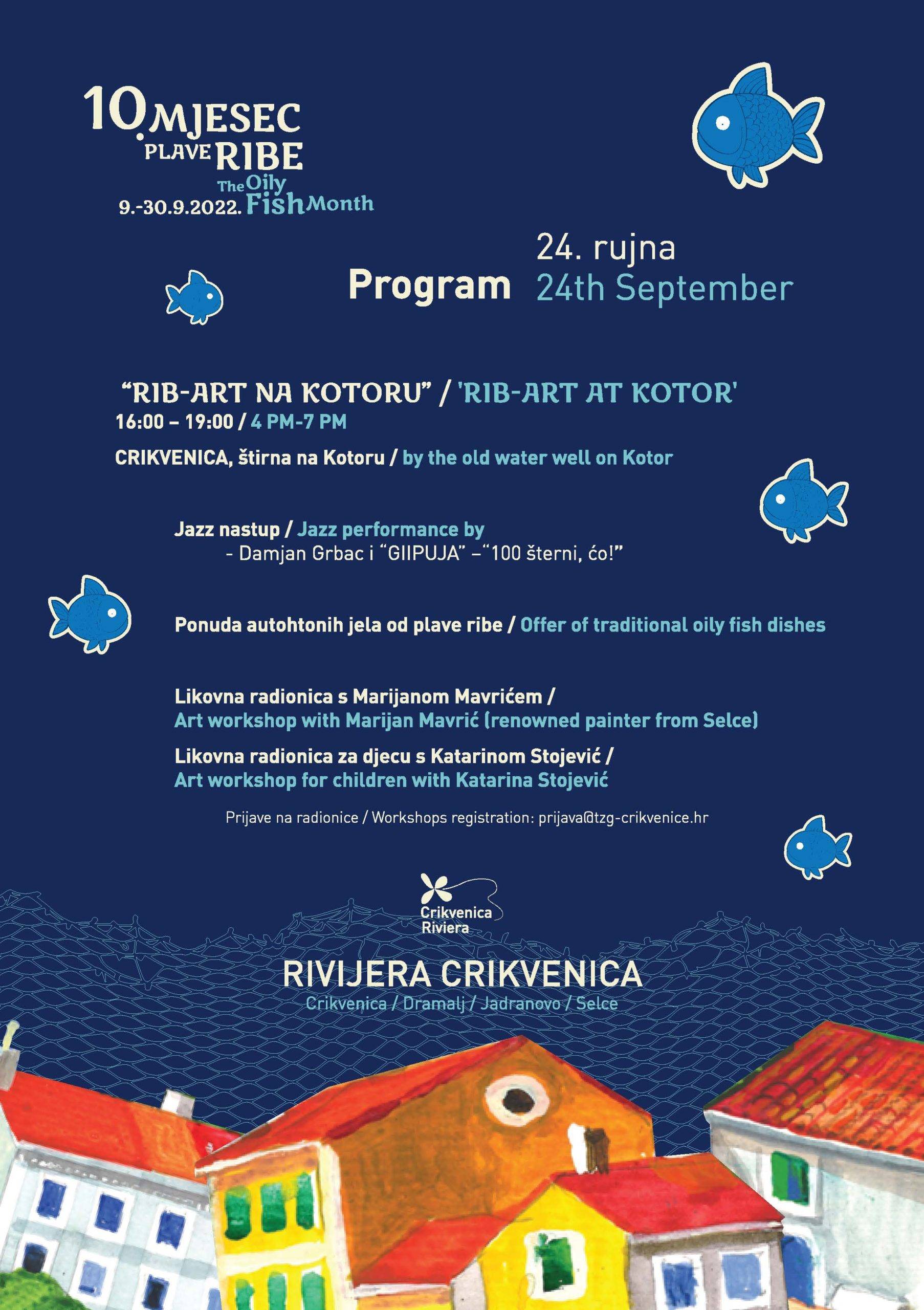 Ako s „Ceste plave ribe“ skrenemo na drugu, makadamsku, korak po korak, doći ćemo do Kotora. Tamo nas čeka jedinstveni doživljaj, kombinacija jazza, jela od plave ribe i umjetnosti – „Rib-art na Kotoru“. Događaj je to koji će se održati 24. rujna od 16:00 do 19:00 sati. Moći ćete uživati u jazz nastupu Damjana Grbca i kvarteta „Giipuja“, ponudi miješanih hladnih predjela od plave ribe uz kapljicu vina te likovnoj radionici Marijana Mavrića i Katarine Stojević (prijave na radionicu: prijava@tzg-crikvenice.hr). Probudite umjetnike u sebi, uživajte u stvaranju vlastitih umjetničkih djela u predivnoj prirodi ili budite pratnja i podrška vašim najmlađima.