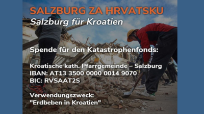 U utorak, 29. prosinca u 12:19 sati Hrvatska je pogođena novim strašnim potresom jačine 6,2 po Richteru s epicentrom u Petrinji, a koji se osjetio u cijeloj Hrvatskoj, BiH, Austriji i Njemačkoj. Hrvatski Centar Salzburg u suradnji s Hrvatska katolička župa bl. Alojzija Stepinca – Salzburg organizira prikupljanje donacija za … Nastavi čitati SALZBURG SOLIDARNO UZ HRVATSKU – Evo gdje i kako možete pomoći stradalima u potresu