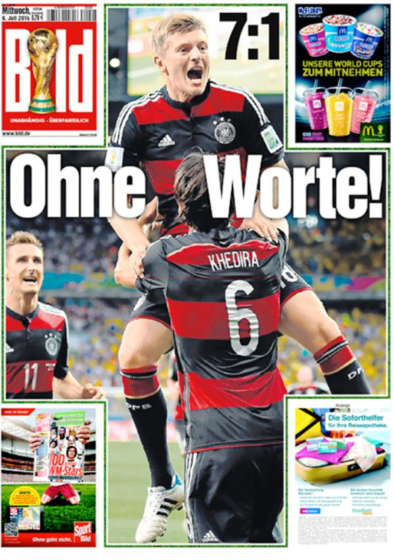 Nogometaši Njemačke plasirali su se u finale Svjetskog prvenstva nakon što su u polufinalu u Belo Horizonteu pobijedili domaćina Brazila s čak 7-1 (5-0), što je i najteži poraz Brazilaca u povijesti. Brazilski izbornik Luiz Felipe Scolari istaknuo je da je ovo najgori dan u njegovu životu.