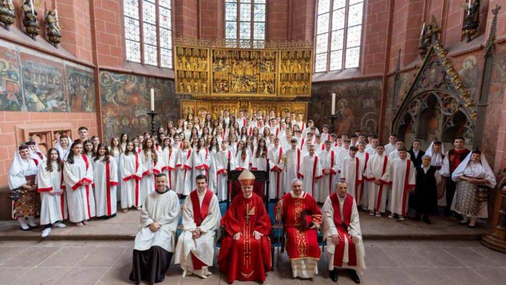 Otac biskup predvodio je svečano misno slavlje u frankfurtskoj katedrali sv. Bartolomeja u zajedništvu s đakonom Marijanom Krajinovićom, mjesnim župnikom fra Petrom Komljenovićom i župnim kapelanima fra Antom Bilokapićom i fra Kristijanom Šilićom. Fra Kristijan je tokom protekle vjeronaučne godine pripremao krizmanike za ovaj veliki dan. Prisutne su bile i sestre koje djeluju u našoj župi: s. Pavlimira Šimunović i s. Filipa Smoljo.