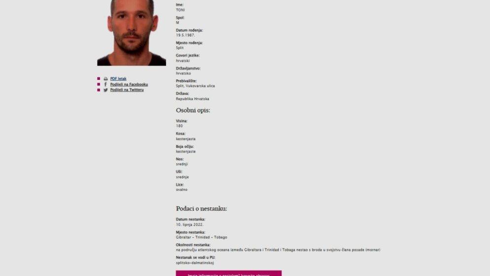 Časnik na brodu Toni Jurišić (1987.) iz Splita nestao je na području Atlantskog oceana između Gibraltara i Trinidad i Tobaga, objavljeno je u četvrtak na portalu Nacionalne evidencije nestalih osoba – Nestali, a u Sindikatu pomoraca kažu da je riječ o brodu grčke kompanije.