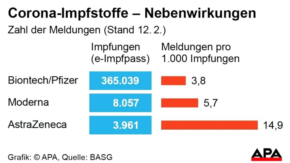 U Austriji je Biontech / Pfizer cjepivom do sada cijepljeno 365.039 građana, od kojih je 1384 prijavilo ‘ozbiljne’ nuspojave. S cjepivom tvrtke Moderna cijepljeno je 8057 ljudi, a zabilježeno je 46 prijava. Najviše pritužbi dobilo je cjepivo tvrtke AstraZence, na 3961 cijepljenu osobu, pristiglo je čak 59 prijava na nuspojave.