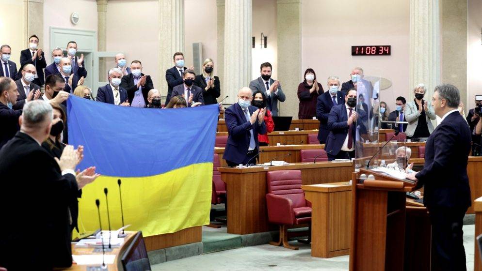“Podržavajući Ukrajinu i poštujući hrabrost Ukrajinaca da ne bježe pred tenkovima, da ne popuštaju pred ucjenama, da ne poginju glavu, da su nadahnuti ljubavi prema domovini kao što su i Hrvati bili u Domovinskom ratu, budimo danas uz Ukrajinu i Ukrajince. Slava Ukrajini”, zaključio je svoj govor Plenković uz pljesak okupljenih i ukrajinske zastave u Sabornici.