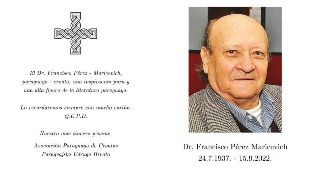 Paragvajska udruga Hrvata izražava najdublje žaljenje zbog smrti don Francisca Pereza-Mariceviča, Paragvajca i Hrvata, potomka don Kuzme Maričevića, koji je preminuo u četvrtak, 15. rujna u 85 godini života.