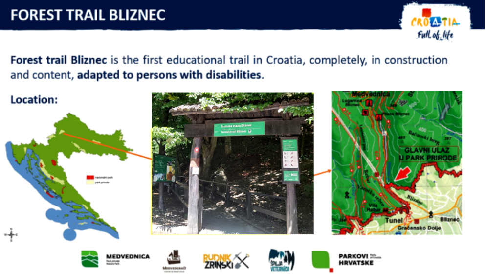 Naime, UNWTO je u sklopu natječaja Good Practices on Accessible Tourism in Rural and Nature Areas među primjere dobre prakse uvrstio projekt Parka prirode Medvednica – Šumsku stazu Bliznec, prvu obrazovnu stazuu Hrvatskoj koja je u potpunosti, konstrukcijom i sadržajem, prilagođena osobama s posebnim potrebama.