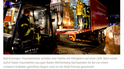 Njemački vatrogasci iz Vatrogasne zajednice Baden-Württemberg u subotu će u Sisak dovesti 90 tona vatrogasne opreme, opreme za bolnice i namirnica. Primopredaja te vrijedne pošiljke bit će ispred sisačke Javne vatrogasne postrojbe u Vatrogasnoj ulici, izvijestili su iz Hrvatske vatrogasne zajednice. Planirani dolazak konvoja je u subotu 2. siječnja između 12 i 13 sati.