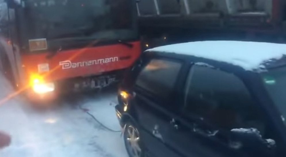 Volkswagen Golf “trojka”, u izdanju VR6 Syncro, inače ima 1,8-litarski dizelski motor snage 90 KS, ali i pogon na sva četiri kotača, što se u ovom zimskom šlepanju pokazalo kao ključno. Kao što vidimo na snimci, za tek nekoliko sekundi autobus je izvučen uzbrdo, po prilično neugodnom skliskom terenu, na oduševljenje njegovog vozača i svih prisutnih.