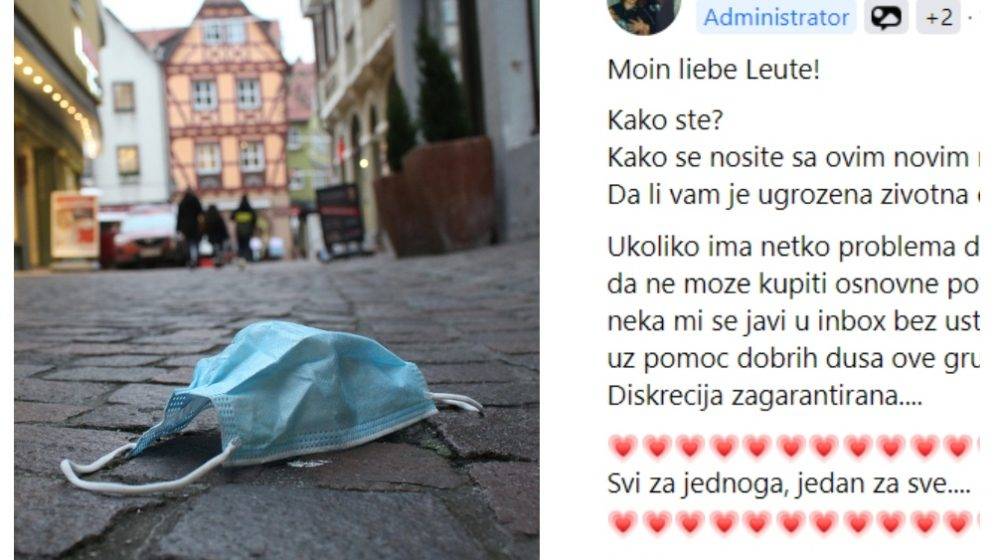 “Moin liebe Leute! Kako ste? Kako se nosite sa ovim novim mjerama? Da li vam je ugrožena životna egzistencija? Ukoliko ima netko problema da ne može preživjeti od plaće do plaće, da ne može kupiti osnovne potrepštine neophodne za normalan život neka mi se javi u inbox bez ustručavanja. Pokušat ćemo nešto riješiti uz pomoć dobrih duša ove grupe. Diskrecija zagarantirana… Svi za jednoga, jedan za sve….”, napisao je Kruno u objavi.